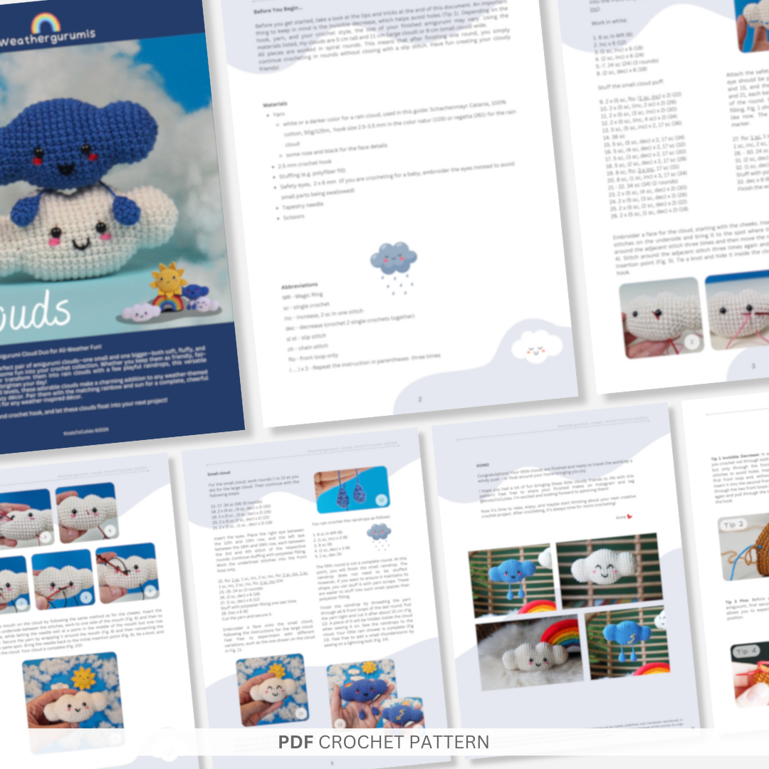 This pattern is suitable for patient beginner crocheters as well as advanced Amigurumi artists. On 7 pages, you’ll find detailed step-by-step instructions with many photos that will help you crochet the weather-gurumis effortlessly.